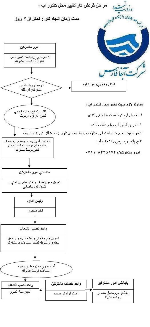 » لطفاً ضمن مراجعه به واحد امور مشتركين اداره آبفا، درخواست كتبي خود مبني بر جابجايي كنتور را به مسئول واحد امور مشتركين ارائه فرمائيد.