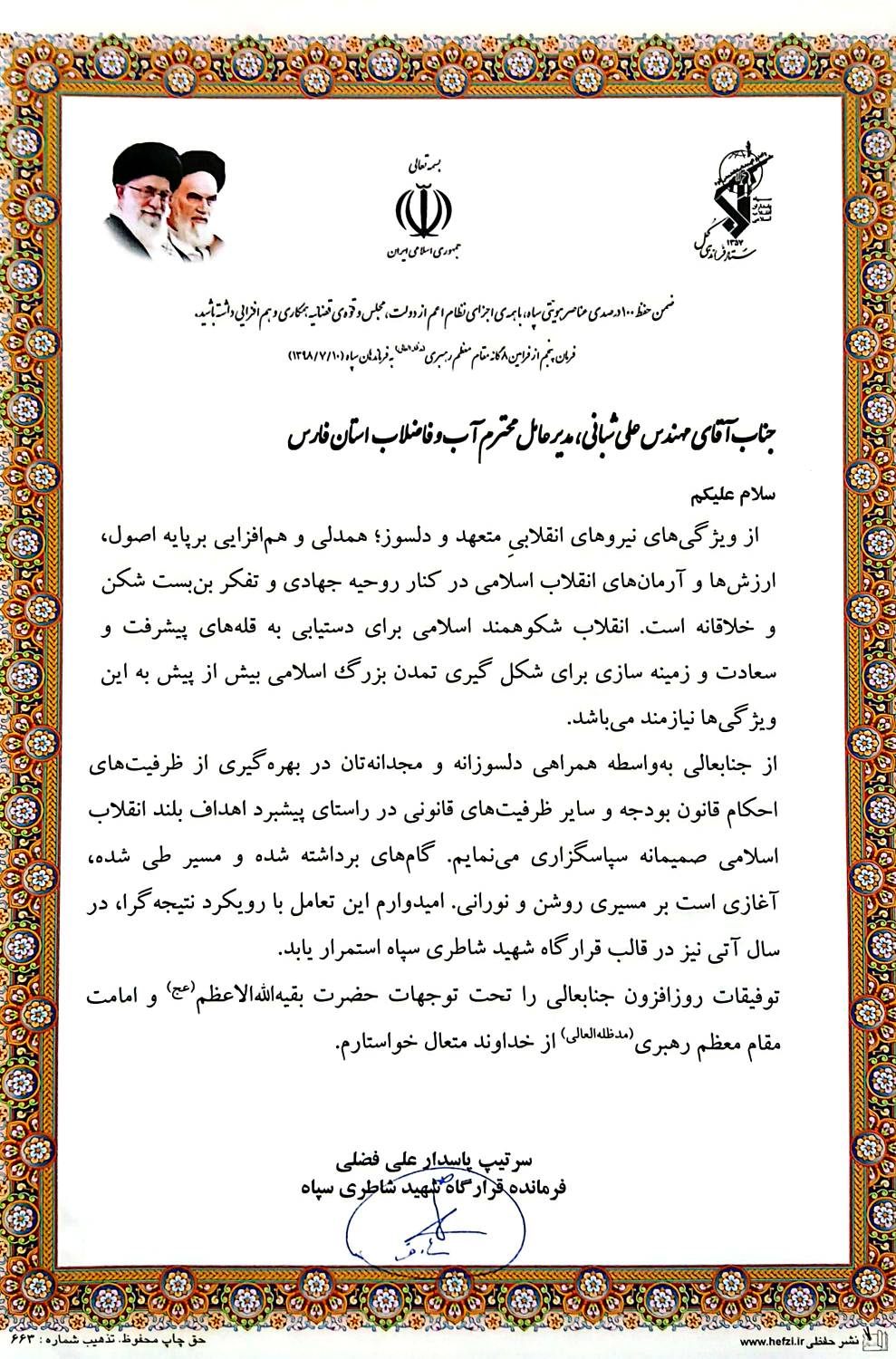 سردار علی فضلی فرمانده قرارگاه شهید شاطری سپاه، با اعطای لوح تقدیری از علی شبانی مدیرعامل شرکت آب و فاضلاب استان فارس به پاس روحیه انقلابی، تعهد، همدلی و تلاشهای ارزشمند در مسیر خدمترسانی به مردم و پیشبرد اهداف انقلاب اسلامی قدردانی کرد.