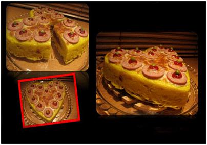 بقیه پنیر پیتزا و سوسیس‌های خردشده و بقیه مایه گوشتی را روی کیک قرار می‌دهیم و آن را برای مدت پنج دقیقه زیر شعله گریل فر قرار می‌دهیم تا پنیرها ذوب و طلایی رنگ شوند.